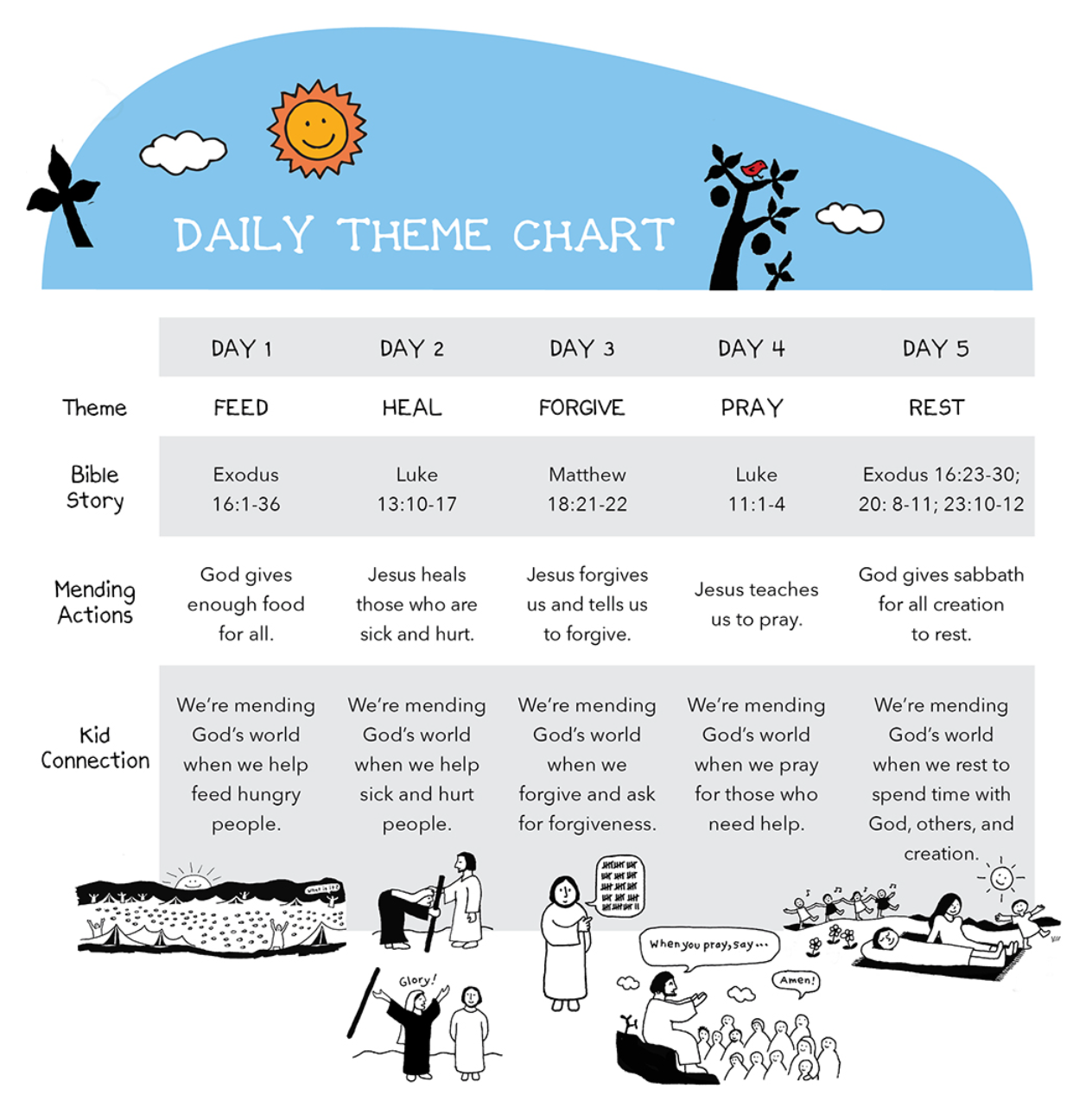 Each camp day is themed to help the children mend God's world through Feeding, Healing, Forgiving, Praying, and Resting.
